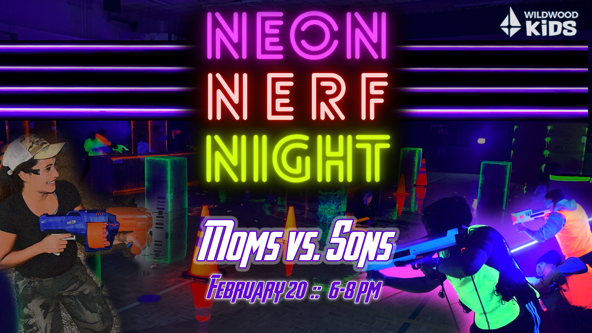 Come ready to battle! This event is for sons in Kindergarten - 5th grade. Glow-in-the-dark night of fun. Snacks and bullets provided. Please register moms + sons. Please bring your own Nerf shooter.